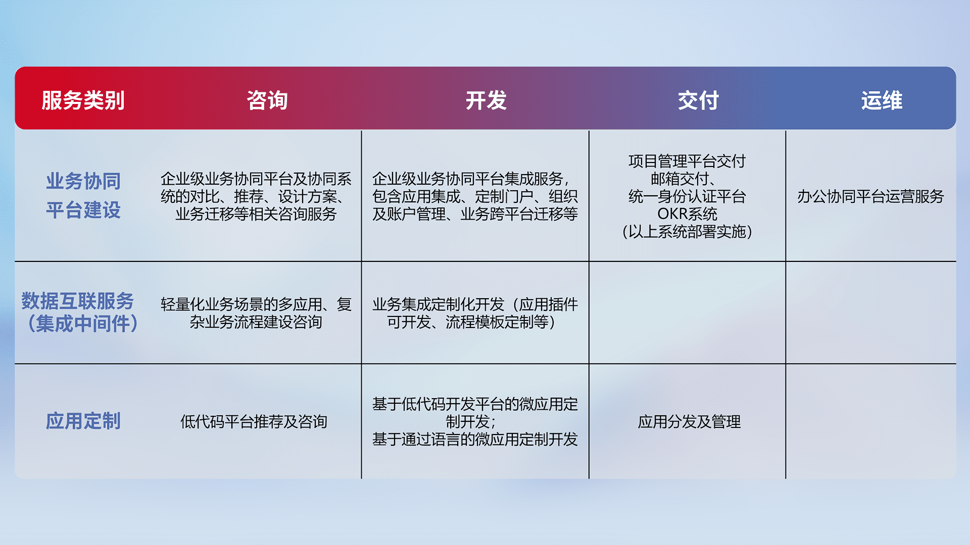 针对钉钉、、、企微、、、IDaas等平台级产品提供产品的规划、、方案、、、交付、、、定制化开发等服务,,实现如统一协同办公、、智能客户服务、、、、混合会议管理、、、、智能数据查询、、、等业务场景,,,,实现数字化转型。。。。